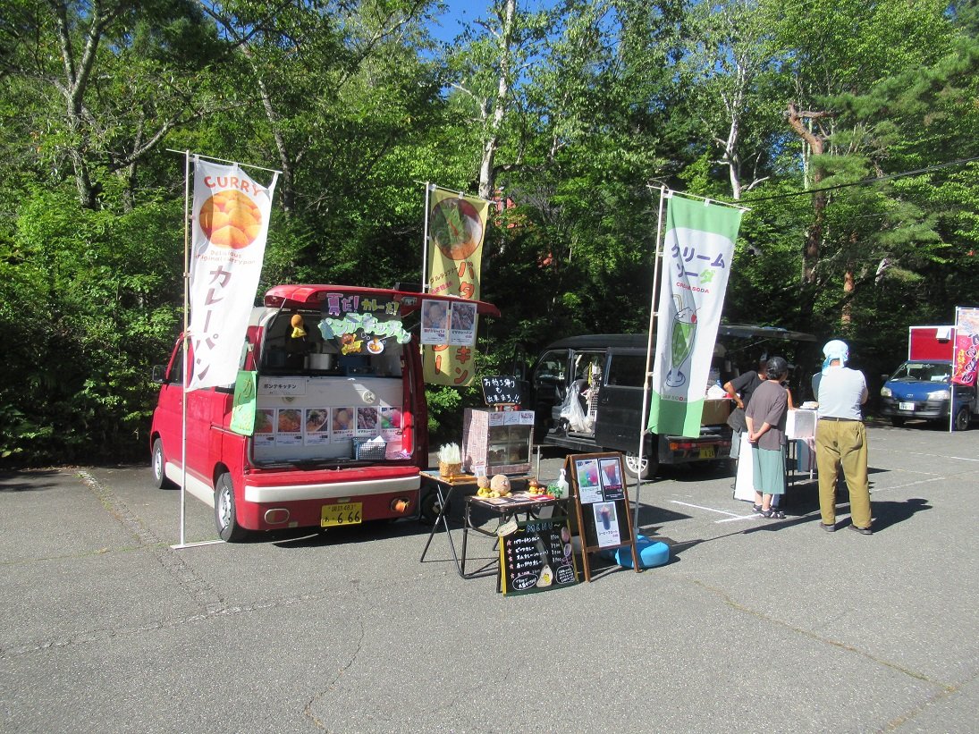 カレーや唐揚げ、うどん、鹿肉バーガー、お惣菜などのキッチンカーも